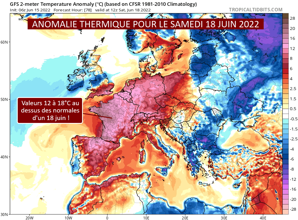 Écart à la normale des températures maximales le samedi 18 juin 2022 - tropicaltidbits.com