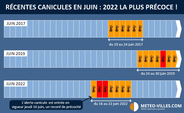 Auparavant, la canicule s'observait surtout à partir de début juillet. Or depuis 2017, trois canicules se sont produites au mois de juin en France. Jusqu'à 2022, la plus précoce avait débuté le 19 juin 2017. Il y a trois ans, l'alerte à la canicule était entrée en vigueur dès le 16 juin 2022, un record de précocité ! Celle-ci avait duré jusqu'à une semaine (levée de l'alerte le 22 juin dans les départements du centre-est). Par ailleurs, les services de Météo France avaient déclenché l'alerte rouge dès le 17 juin 2022, battant un autre record de précocité (ancien record avec l'alerte rouge du 28 juin 2019) !