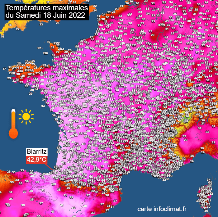 Lors de l'après-midi du samedi 18 juin 2022, la température moyenne en France est de 37°C ! Le seuil des 40°C est atteint et parfois dépassé du sud-ouest jusqu'en région Centre et dans les Pays de la Loire ! On assiste même à des records absolus, comme à Biarritz où le thermomètre s'envole jusqu'à 42,9°C, soit la valeur la plus haute jamais mesurée (tous mois confondus) depuis l'ouverture de la station en 1953 ! Dans le département des Landes, la station de Pissos établit la température maximale de cette canicule avec 43,4°C !