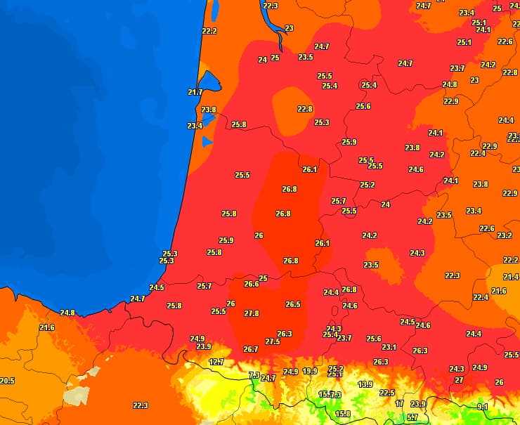 Températures maximales en Aquitaine le mercredi 21 octobre 2020 - via meteociel.fr
