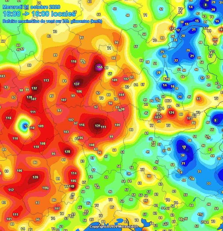 Rafales maximales en Auvergne-Rhône-Alpes au passage de Barbara - via meteociel.fr