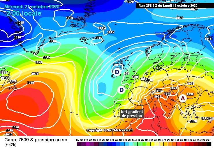Situation à échelle continentale pour le mercredi 21 octobre 2020 - modèle GFS via meteociel.fr