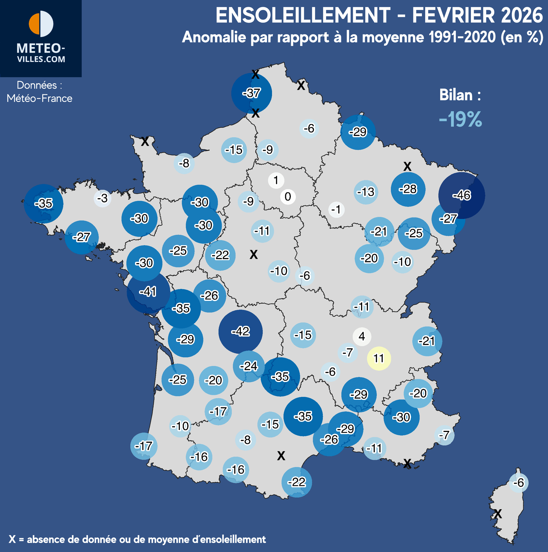 Qui dit influence océanique, dit grisaille omniprésente. En effet, ce mois de février a été relativement peu ensoleillé, avec un déficit qui atteint -19% sur notre panel national de stations.