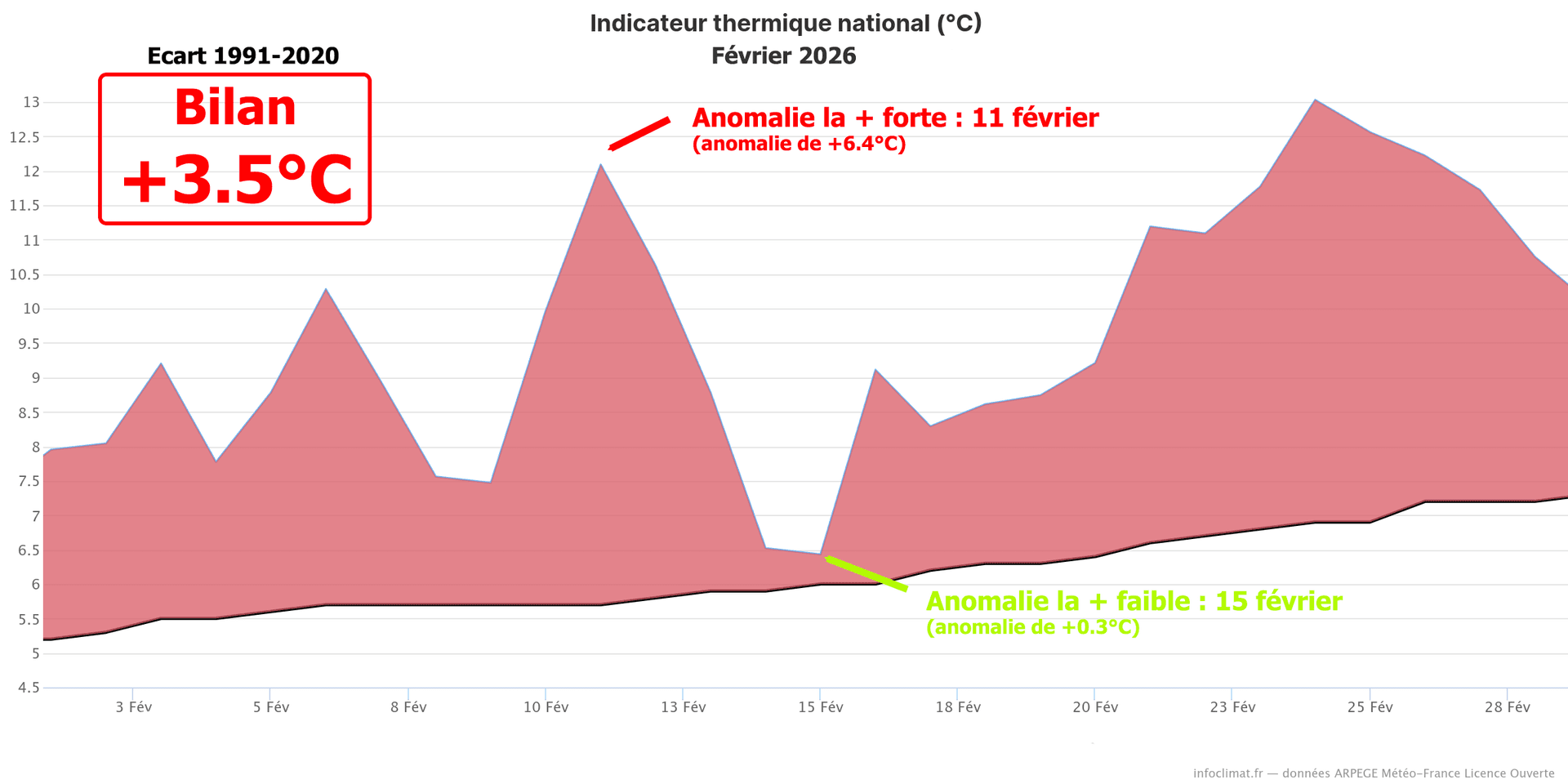 Anomalie de la température quotidienne en février 2026 en France - écart à la moyenne 1991-2020 - Infoclimat