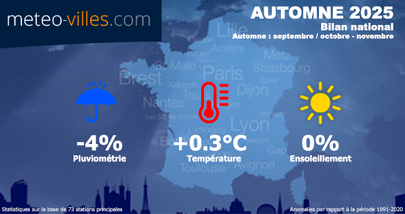 Comme à chaque début de mois, nous vous proposons un nouveau bilan climatologique. Place désormais au bilan cartographié de l'AUTOMNE MÉTÉOROLOGIQUE 2025 en termes de température, pluviométrie et ensoleillement sur un panel de 73 stations*. Pour rappel, l'automne météorologique comprend les mois de septembre, octobre et novembre. Les anomalies présentées sont calculées à partir des moyennes climatiques de la période de référence 1991-2020 sur l'ensemble des stations du panel.
