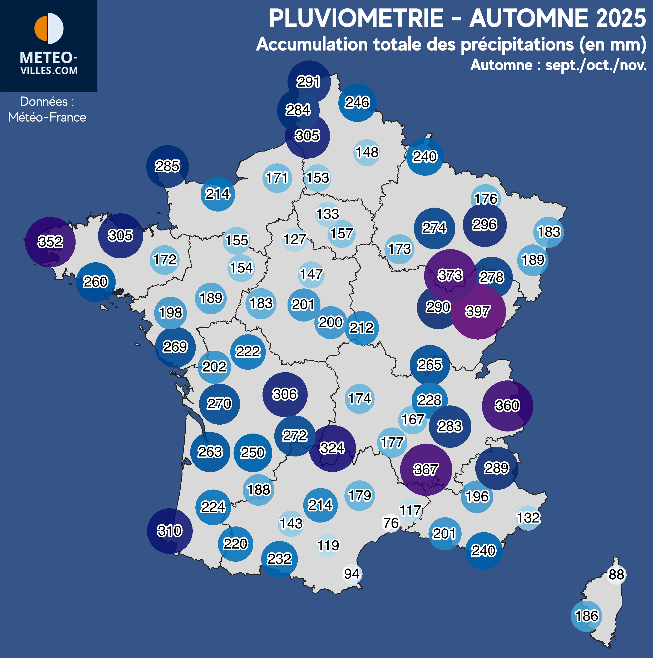 Traduit en cumul pluviométrique, les villes les plus arrosées au cours de cet automne ont récolté plus de 300mm. Elles se situent sur le Pays Basque (310mm à Biarritz), sur l'Ouest du Massif-Central (324mm à Aurillac), près des côtes de la Manche (305mm à Abbeville et 352mm à Brest), et surtout dans les régions de l'Est (367mm à Montélimar, 397mm à Besançon).