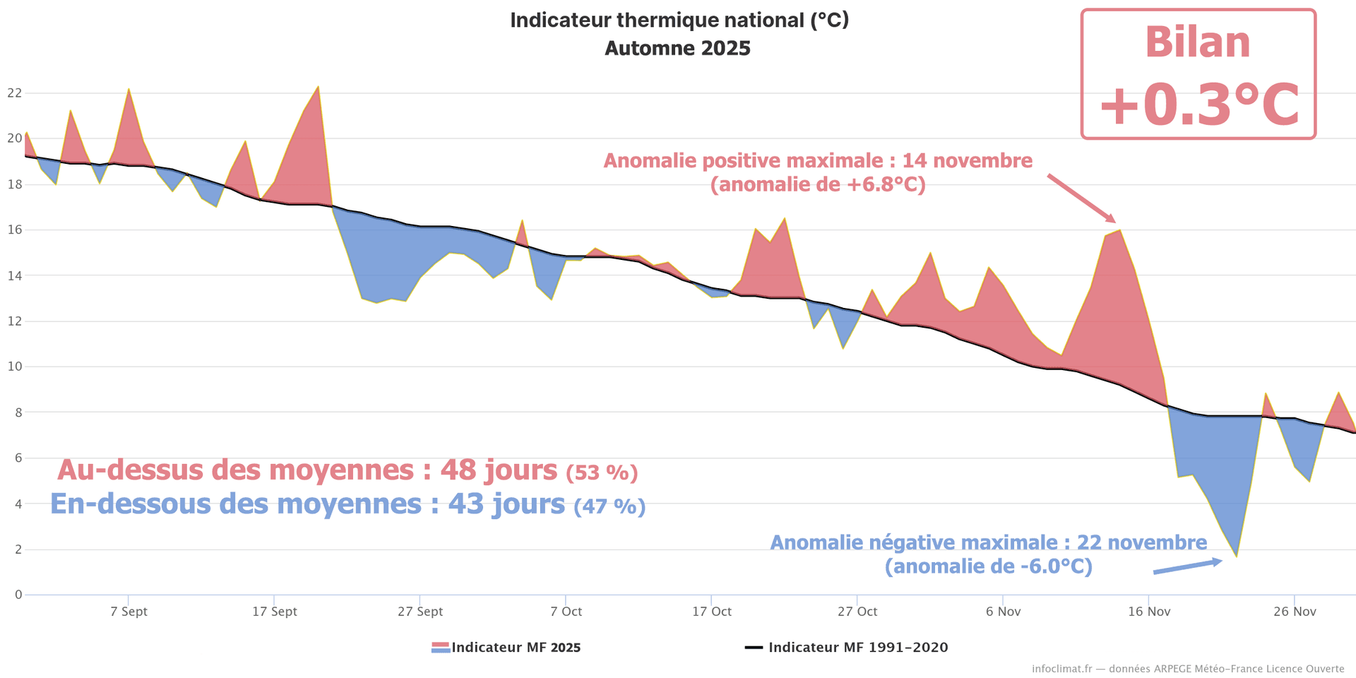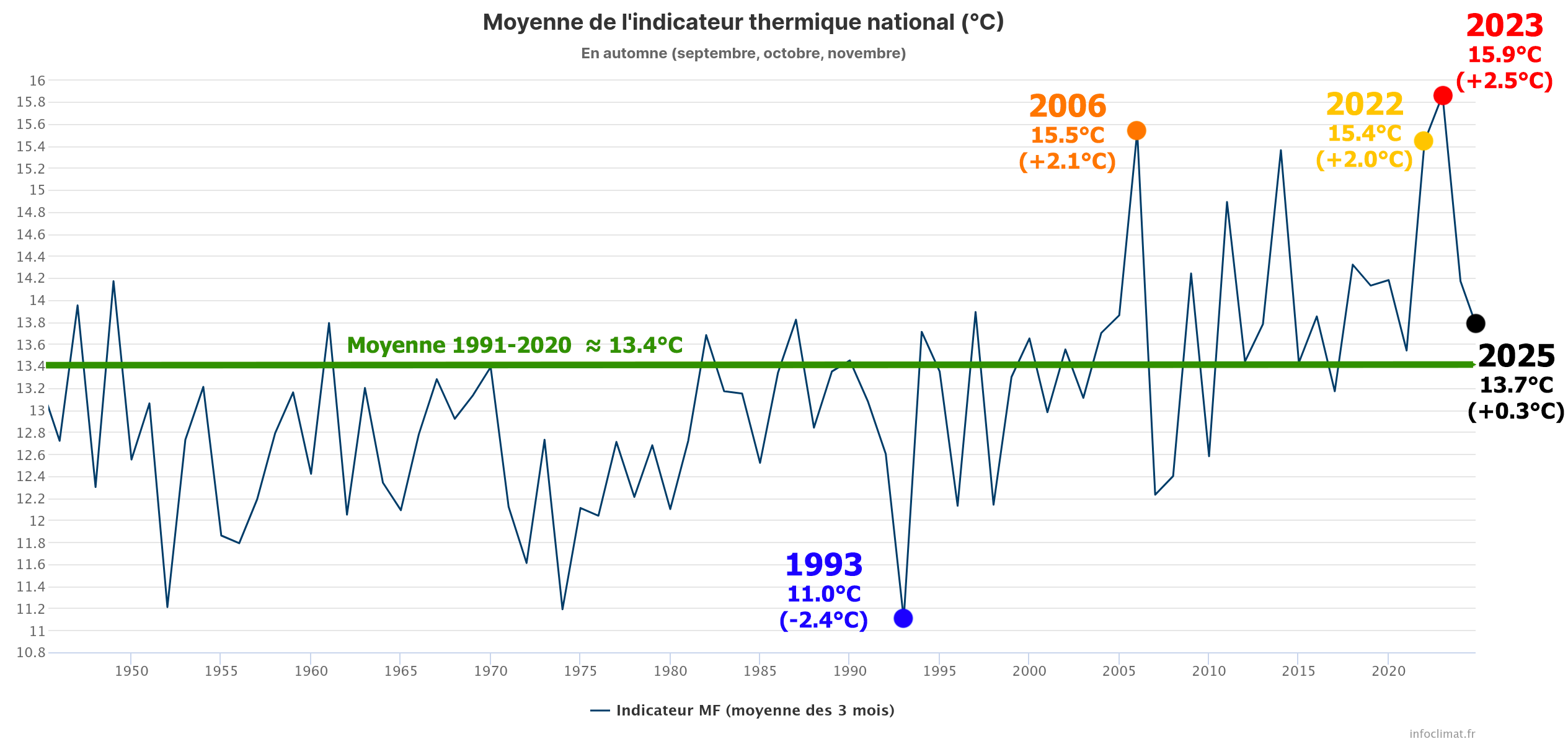 Indicateur thermique national pour l'automne météorologique 2025 depuis l'après-guerre (1946) - Infoclimat