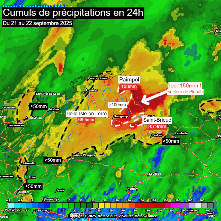 Ces cumuls représentent parfois des records sur les secteurs les plus touchés. À Saint-Brieuc par exemple, l'ancien record journalier de 55,5mm le 3 octobre 2020 a été pulvérisé durant cette journée du 21 septembre. Également les lames d'eau estiment plus de 150mm en seulement 24h dans le secteur de Plouha, ce qui constituerait un record départemental durant ce laps de temps.