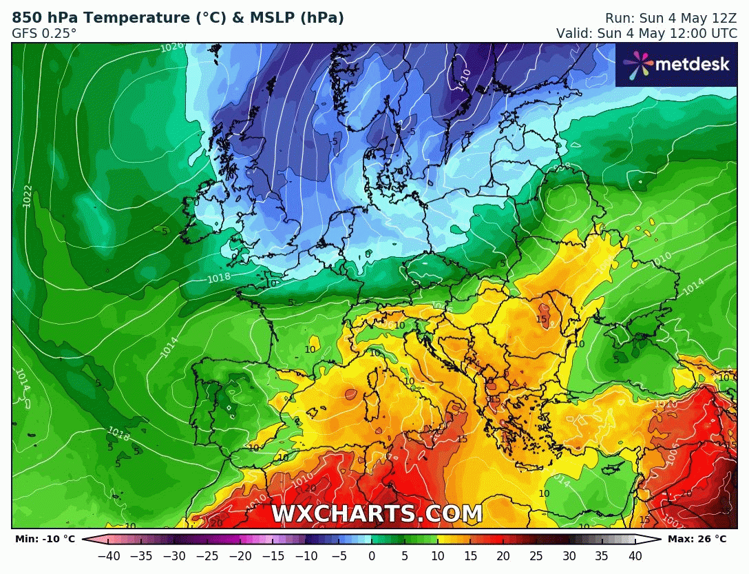 Animation des températures à 850 hPa sur l'Europe du 4 au 8 mai 2025 – Modèle GFS via WX CHARTS