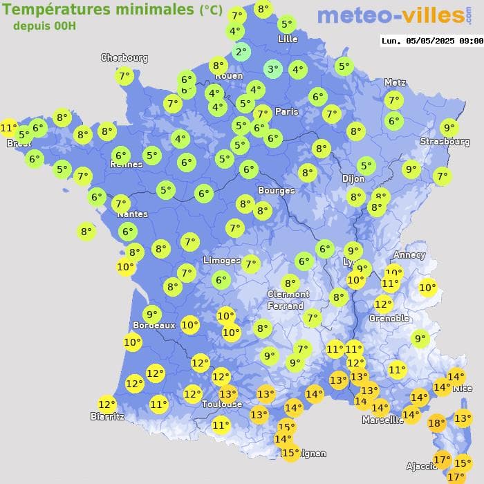 Températures minimales relevées sur la France ce 5 mai 2025 – Météo-Villes