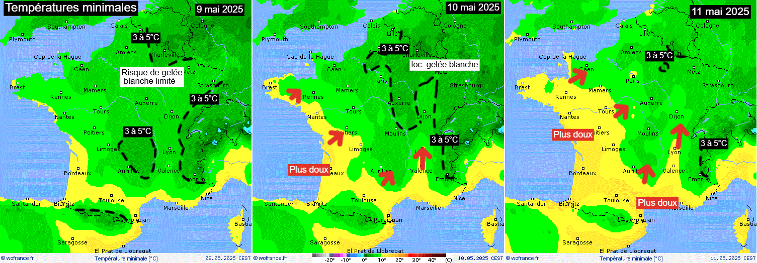 Températures minimales attendues sur la France du 9 au 11 mai 2025 – via WoFrance