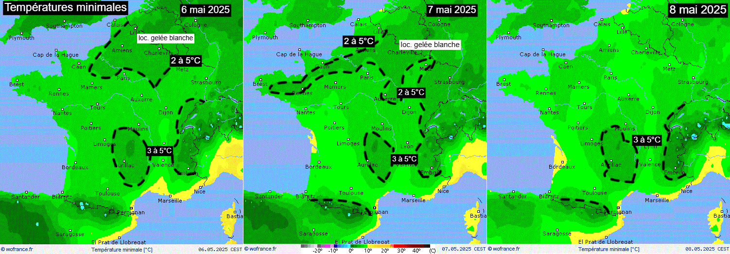 Températures minimales attendues sur la France du 6 au 8 mai 2025 – via WoFrance