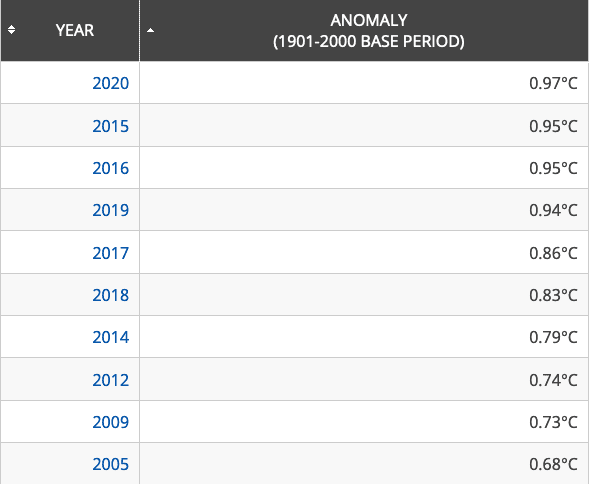 Top 10 des mois de septembre les plus chauds dans le Monde - anomalie par rapport au XXe siècle - NOAA