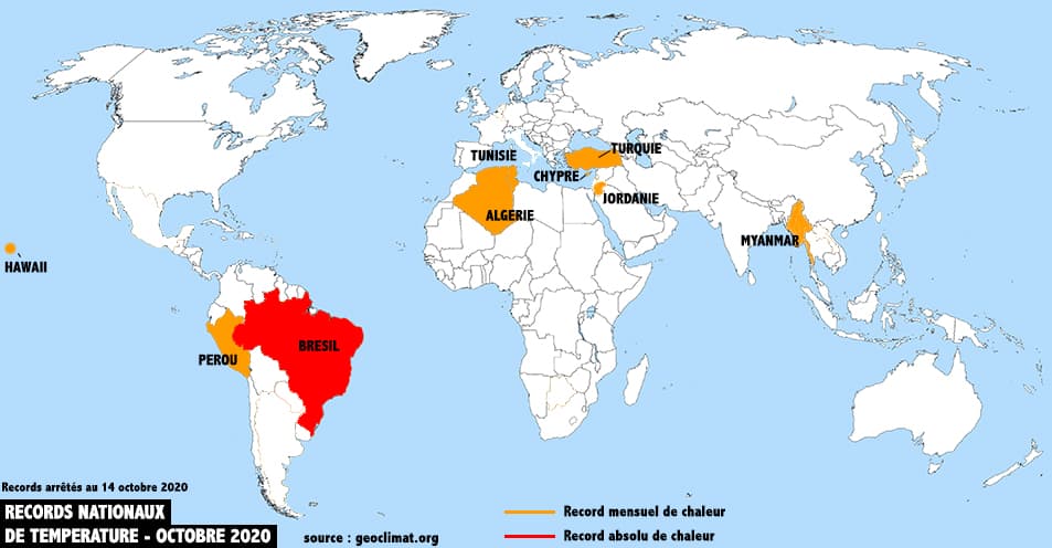 Records nationaux de températures (chaleur / fraîcheur) battus au cours du mois d'octobre 2020 - (au 14 octobre)