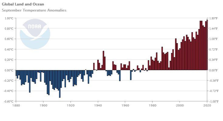 Avec une anomalie de +0.97°C selon la NOAA (Agence américaine d’observation océanique et atmosphérique), septembre 2020 bat un record significatif : celui du mois de septembre le plus chaud jamais mesuré à travers la planète (soit depuis 1880). Il bat le(s) records de septembre 2015 et 2016, alors ex-aequo avec +0.95°C.