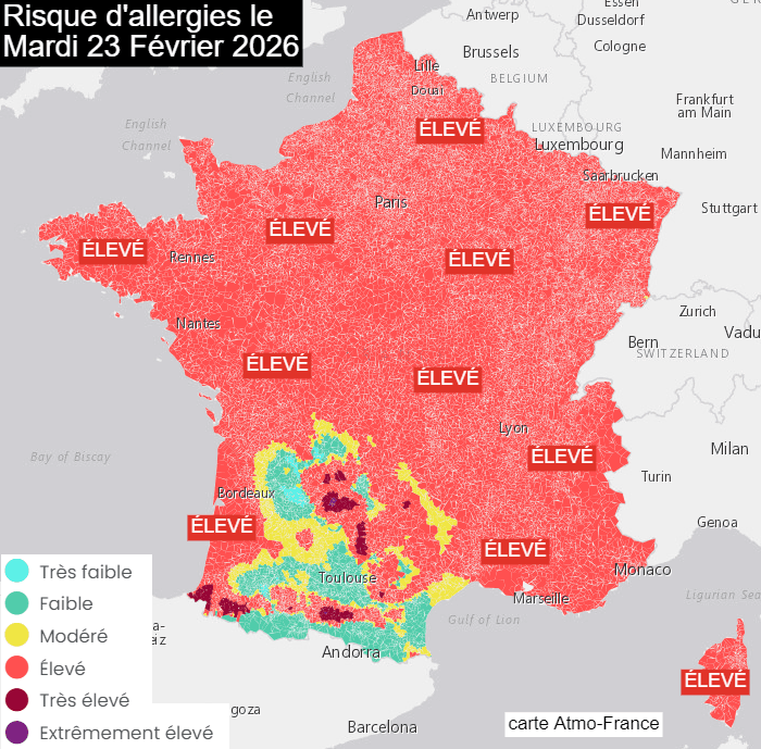 Par conséquent, les pollens font leur retour en force et les risques allergiques seront élevés en France durant cette semaine aux airs printaniers. Ce mardi 23 février 2026, le risque d'allergies sera d'un niveau jugé "élevé" par Atmo-France sur la majeure partie des régions, parfois un peu moindre dans certains secteurs du sud-ouest. Cette situation se répètera mercredi et jeudi, avant des risques moins élevés vendredi en raison du passage d'un front pluvieux.