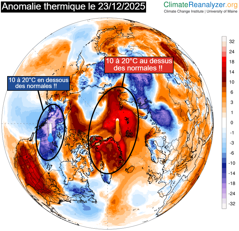 En cette fin d'année 2025, les régions polaires sont soumises à des températures remarquablement "douces". Les températures actuelles au Groenland et près du Pôle Nord se situent 10 à 20°C au dessus des normales de saison ! Ce lundi 22 décembre 2025, la base de recherche de Summit Camp - située à 3204 mètres d'altitude au Groenland - a enregistré une température maximale de -14,1°C, alors que la moyenne à cette saison est de -34°C ! Cela constitue un écart de +20°C aux normales ! Le vortex polaire, quant à lui, est déplacé vers l'Alaska où une importante anomalie froide est observée.