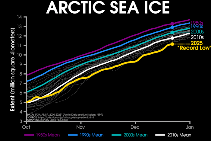 Superficie de la banquise arctique d'octobre à fin décembre de 1980 à 2025 (courbe de 2025 en jaune) - via zacklabe.com