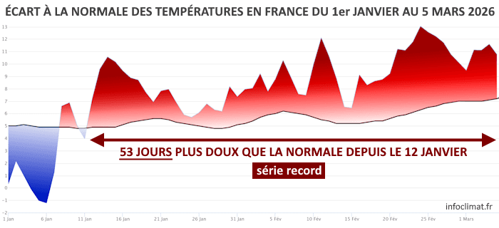 En France, le dernier jour ayant enregistré un bilan thermique inférieur à la normale fut le 11 janvier 2026. Depuis, notre pays est sur 53 jours consécutifs plus doux que la normale entre le 12 janvier et le 5 mars ! Une série aussi longue n'a jamais été enregistrée depuis le début des relevés météorologiques. De plus, l'ampleur de l'anomalie sur cette période de 53 jours est particulièrement marquante puisqu'on frôle les +3°C à échelle nationale, un chiffre vraiment remarquable lorsque l'on sait qu'il s'agit d'une moyenne lissée sur 7 semaines et demies !