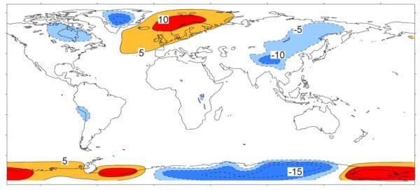 Déviation de température par rapport à la moyenne de la latitude - L'Europe du Nord et jusqu'à plus de 10°C trop chaude par rapport à sa latitude - Extrait de Rahmstorf et Ganopolski en 1999.