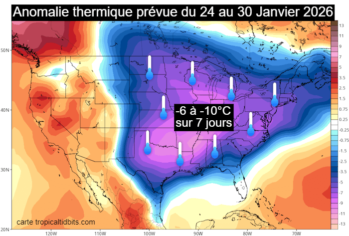 Ce froid polaire va s'installer jusqu'à la fin du mois de janvier 2026 dans les États du nord, du centre et de l'est des USA, qui s'apprêtent donc à vivre une vague de froid marquée. Comme le montre la carte ci-dessous, l'écart à la normale calculé sur 7 jours - entre le 24 et le 30 janvier 2026 - atteindra -6 à -10°C sur plus de la moitié du territoire des États-Unis, jusqu'au nord du Texas ! Un tel déficit est considérable et montre que cette vague de froid ne sera pas anodine.