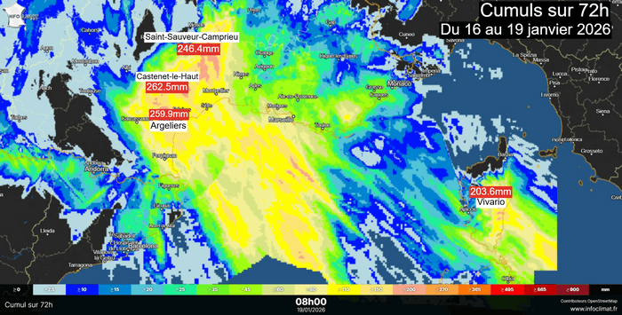 >> Languedoc Roussillon :  262.5 mm à Castenet-le-Haut (34), 260 mm à Argeliers (11), 246 mm à Saint-Sauveur-Camprieu (30), 242 mm au Pont-de-Montvert (48), 234 mm à Saint-Jean-de-Minervois (34), 223 mm à Cambon-et-Salvergues (34), 209 mm à Bassurels (48)