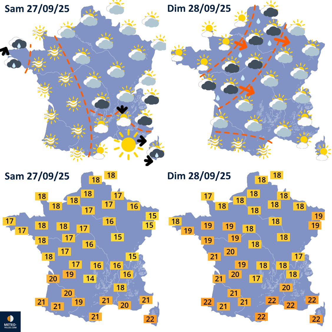 Prévisions météo pour les samedi 27 et dimanche 28 septembre 2025 - Météo Villes