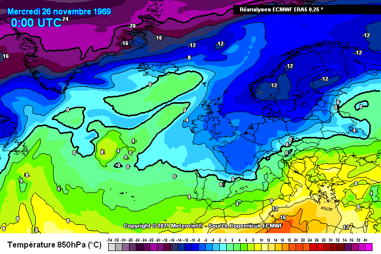 Le 26 novembre à minuit, la masse d'air polaire originaire de Scandinavie, et accompagnée de neige, a déjà envahit presque toute la France - masse d'air à 850 hPa
