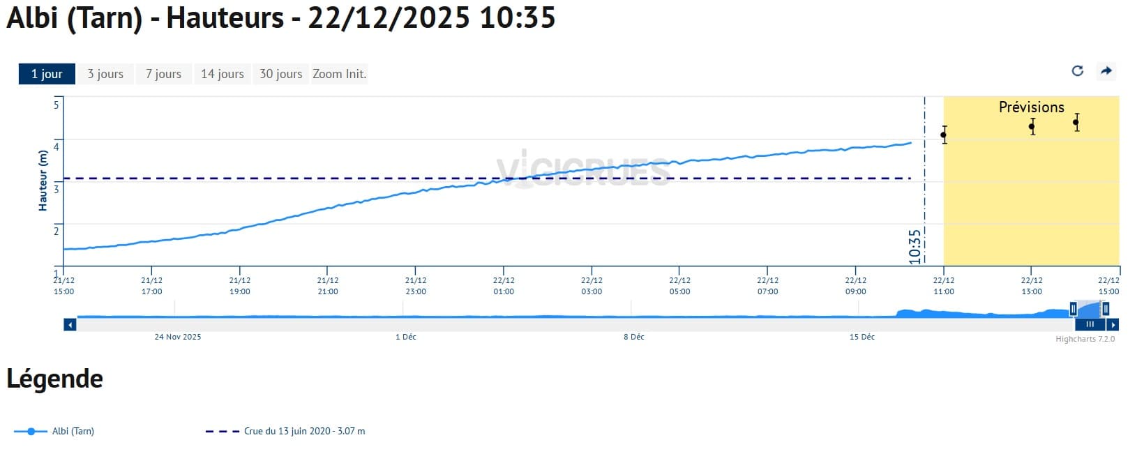 L'Aveyron a dépassé sa crue du 2 février 2011 mais reste encore derrière celle du 4 décembre 2003. Le Tarn continue également de monter, le cours d'eau ayant dépassé la crue du 13 juin 2020 à Albi, où son niveau devrait s'approcher des 4m50 dans la journée.