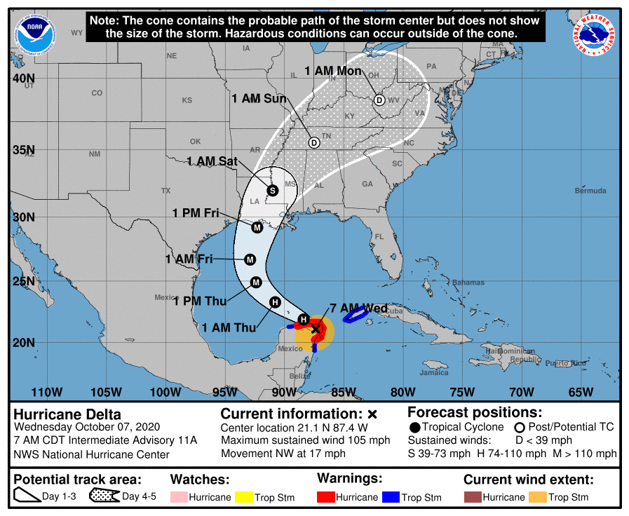 Trajectoire prévue du cyclone Delta dans les prochains jours - Via nhc.noaa.gov