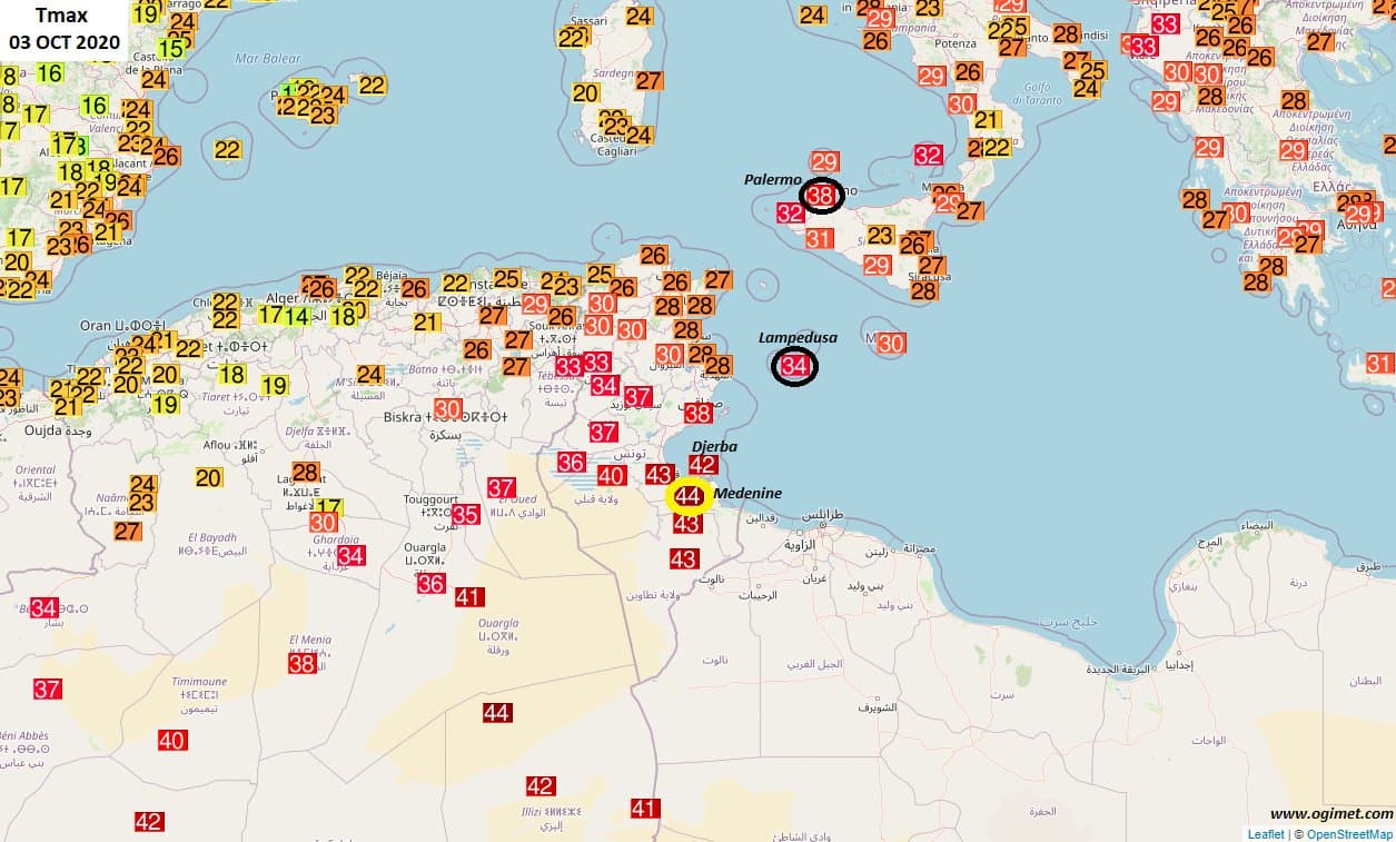 Carte des températures maximales relevées le 3 Octobre 2020 sur le Sud de la Méditerranée - Via ogimet.com