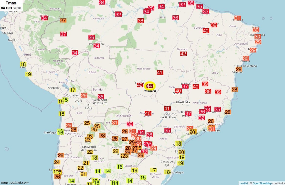 Sur le Sud du continent Américain la chaleur se montre exceptionnelle depuis le début du mois d’Octobre. De nombreux records mensuels nationaux ont été battus entre le Brésil, le Parraguay et l’Argentine. Le thermomètre a atteint 44.4°C à Filadelfia (Parraguay, record national pour Octobre) ou encore 44.0°C à Poxoréo (Brésil, record national pour Octobre).
