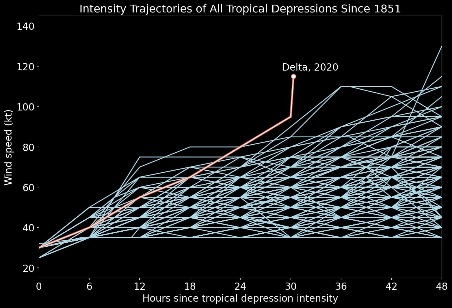 C’est ainsi que la tempête Delta fut nommée. Formée dans les Caraïbes en journée de Lundi, celle-ci a subi une intensification exceptionnellement rapide, passant du stade de tempête tropicale au stade d’Ouragan majeur de catégorie 4 en moins de 30h. C’est la première fois qu’une tempête atteint ce stade en aussi peu de temps :