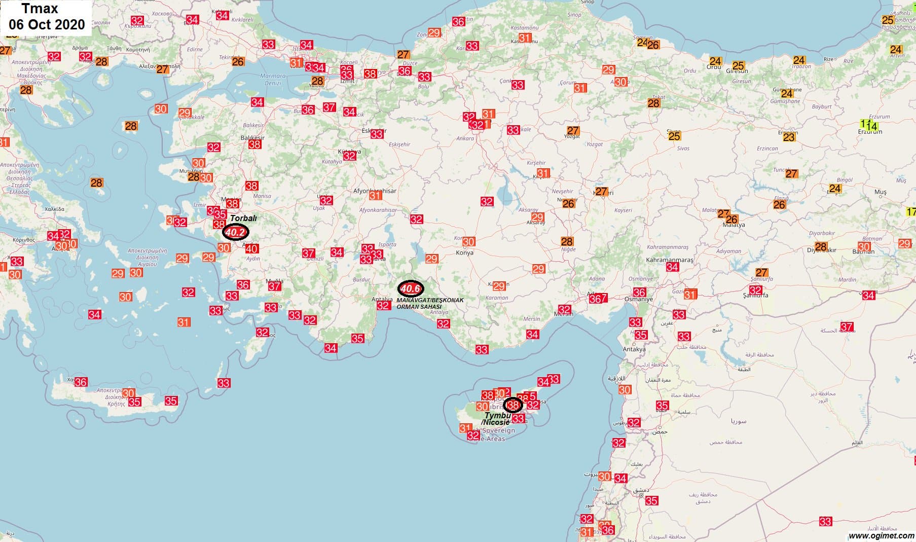 Dans le Sud de l’Europe, si le temps est plus calme c’est la chaleur qui fait parler d’elle. Entre la Turquie et Chypre les températures ont régulièrement dépassé les 35°C ce week-end, jusqu’à 40.6°C dans la province de Manavgat (record national de chaleur en octobre), 40.2°C à Torbali (ancien record de 40.2°C datant d’octobre 1991 égalé.