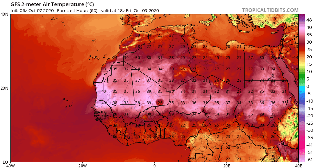 Températures maximales prévues pour le Vendredi 9 Octobre sur le Nord du continent africain - Via tropicaltidbits.com