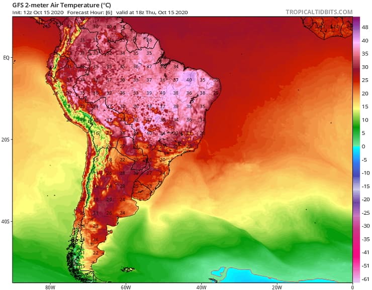 Températures maximales en Amérique du Sud ce vendredi 16 octobre 2020 - via tropicaltidbits.com
