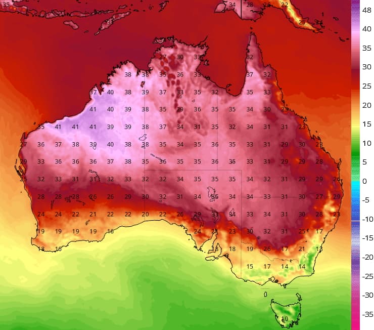 Températures maximales en Australie ce vendredi 16 octobre 2020 - via tropicaltidbits.com