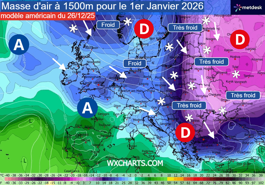 Masse d'air à 1500m vue par le modèle américain du 26/12/25 pour le 1er janvier 2026 - wxcharts.com