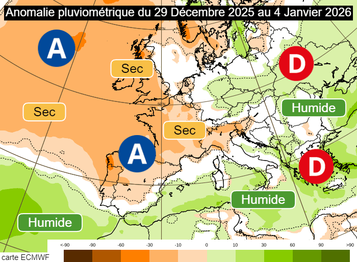Anomalie pluviométrique en semaine du lundi 29 décembre 2025 au dimanche 4 janvier 2026 - ECMWF