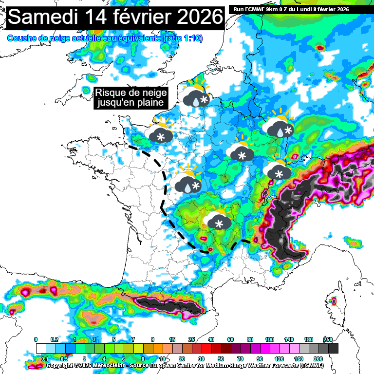 Risque de neige jusqu'en plaine en France pour le samedi 14 février 2026 – Modèle ECMWF via meteociel
