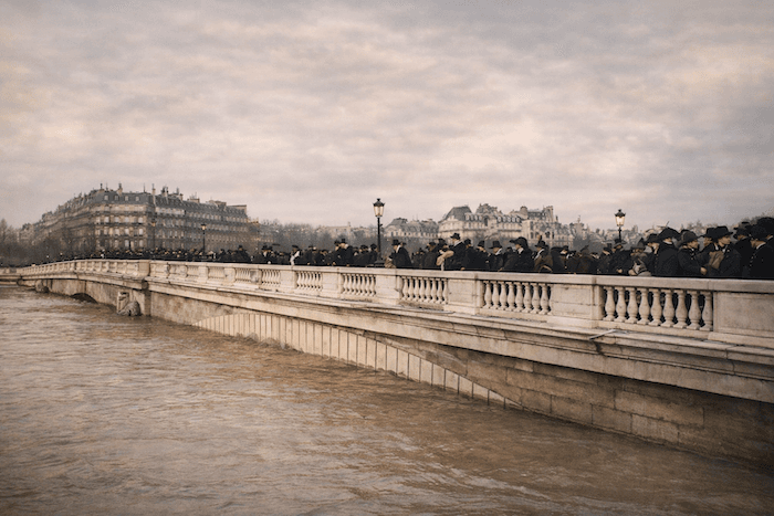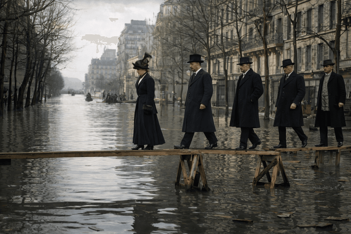 L’eau, glaciale et souillée, submerge les rues pavées en bois qui flottent à la surface. Les égouts refoulent, obligeant les habitants à improviser des passerelles de fortune avec des portes, des tables ou des planches pour accéder à leurs logements. Les Parisiennes, contraintes par leurs robes longues et leurs corsets, peinent à se déplacer dans cette ville transformée en marécage.