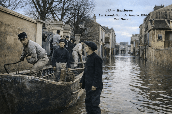 La rue Dussau à Asnières où les secours militaires interviennent durant la crue en janvier 1910 - via wikipedia - photo colorisée