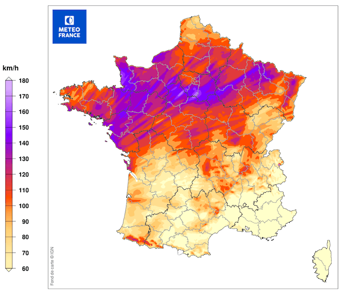 Carte des rafales de vent maximales mesurées dans la journée du 3 février 1990 : le vent dépasse alors 130 km/h sur un axe allant des Pays de la Loire, à la Basse-Normandie, au sud de l'Île-de-France et à la Lorraine...