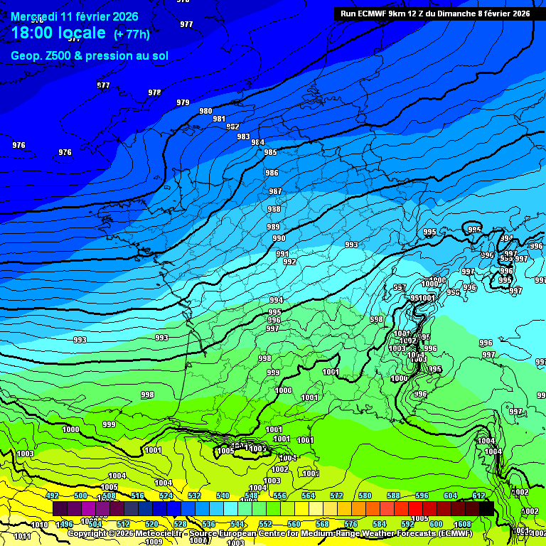 Évolution de la dépression entre mercredi soir et vendredi matin selon le modèle METEO européen  - source fond de carte : Meteociel