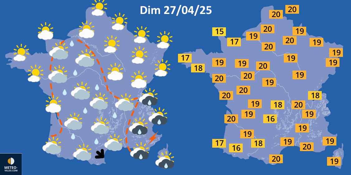 L'instabilité devrait quelque peu reculer en journée du dimanche 27 avril 2025. C'est vers les régions alpines et la Corse que les averses s'annoncent les plus fréquentes, pouvant être orageuses en cours d'après-midi (surtout sur le sud des Alpes). Ailleurs, le ciel sera partagé entre nuages et éclaircies avec des ondées devenant localisées. Les plus larges éclaircies devraient concerner le nord-est et la Bretagne. Les températures diurnes seront en hausse avec des valeurs douces et homogènes, souvent comprises entre 18 et 20°C.