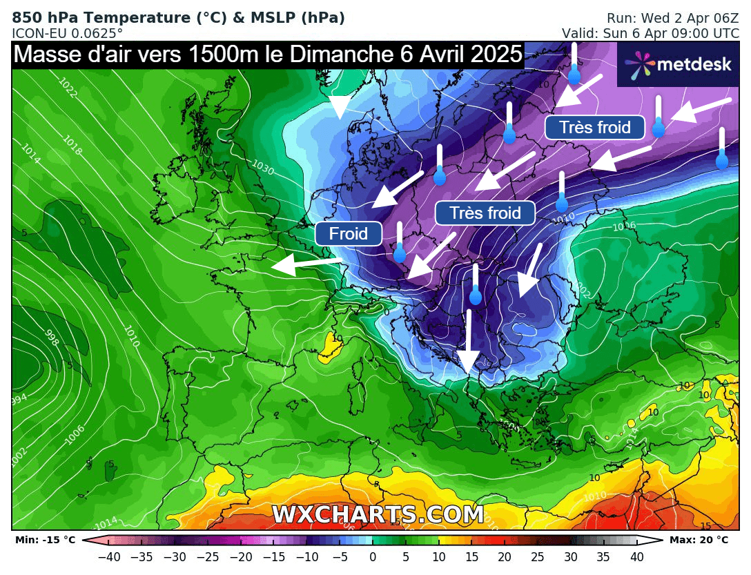 Masse d'air à 850 hPa (vers 1500m) pour le dimanche 6 avril 2025 - wxcharts.com