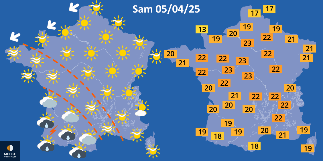 La journée du samedi 5 avril 2025 sera largement dominée par le soleil. Les nuages seront discrets ou absents dans le nord, le centre et l'est. En revanche, ils seront plus nombreux au sud-ouest où quelques averses orageuses sont susceptibles de se déclencher, notamment vers les Pyrénées. Il fera particulièrement doux avec des maximales comprises entre 20 et 23°C sur les 3/4 du territoire. L'air frais ne concernera que les rivages de la Manche et de la Mer du Nord, exposé au vent de nord-est (bise).