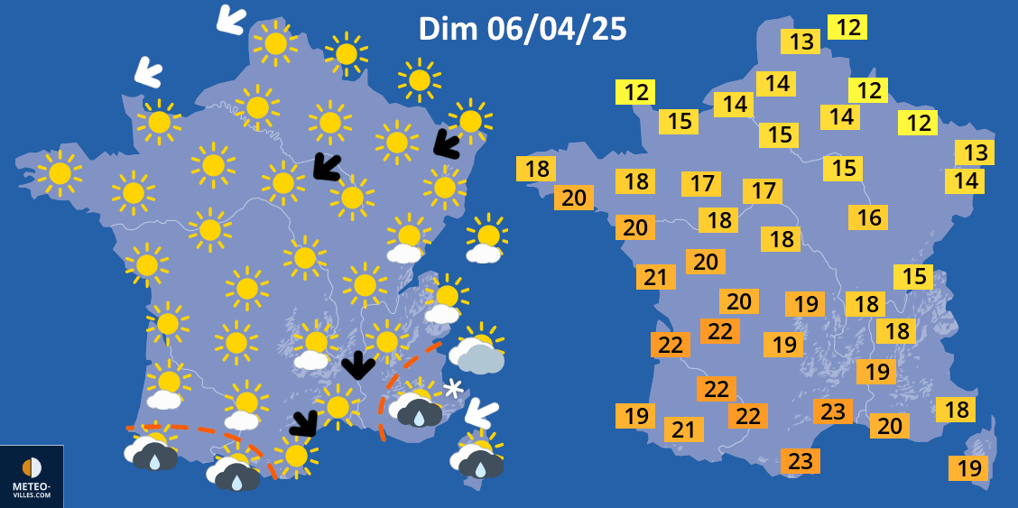 Le soleil restera le protagoniste principal de la journée du dimanche 6 avril 2025. Quelques averses pourront tout de même se déclencher vers les Pyrénées, sur la Provence, la côte d'Azur et la Corse. Les températures seront encore très douces au sud de la Loire, atteignant 19 à 22°C en général. En revanche, elles baisseront dans le nord du territoire avec des maximales plafonnant vers 12 à 14°C au nord et à l'est de la Seine, où la fraîcheur se fera sentir sous l'effet du vent de nord-est (bise).