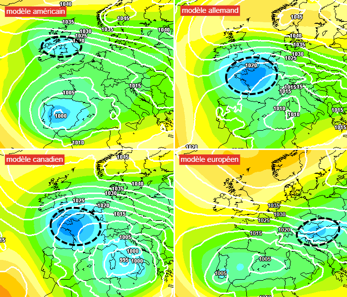 Position de la goutte froide selon les différents modèles au soir du mercredi 17 décembre 2025 - meteociel.fr