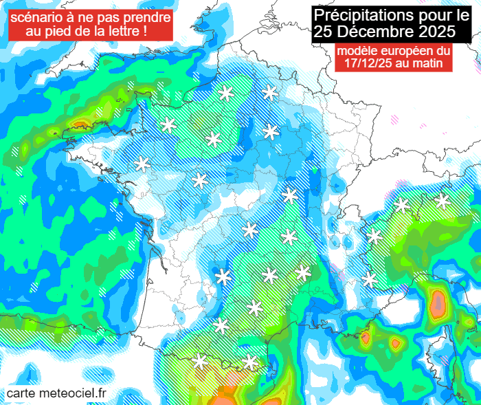 Précipitations pour le jeudi 25 décembre 2025 selon le modèle européen du 17/12/25 - via meteociel.fr